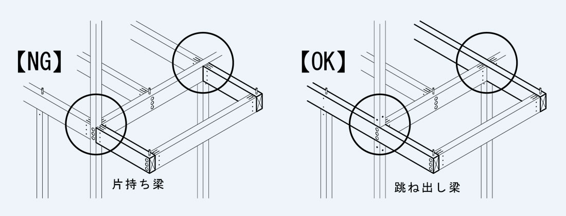 ※跳ね出し梁先端は木口同士の接合となるため、通常の耐力は確保できない可能性があります。