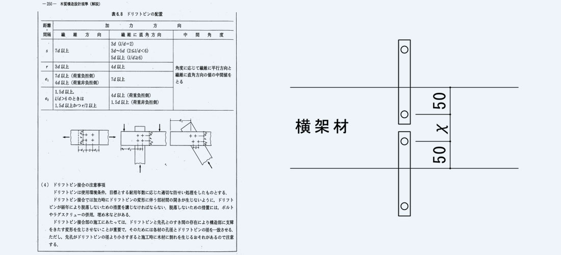 <参考>「木質構造設計規準・同解説(2006年版)」(日本建築学会 発行)に記載されている下表を引用すると、ドリフトピンの間隔はドリフトピン径の4d以上必要ということになります。