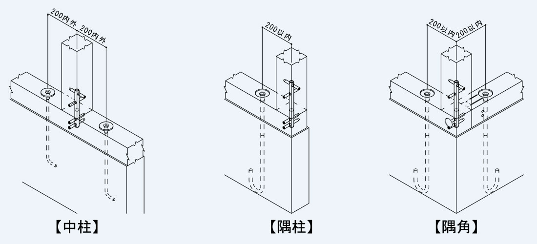 引抜が生じる柱が取り付く土台が、アンカーボルトにて柱芯より両側に200㎜内外(誤差20㎜程度)で基礎に緊結されている箇所。