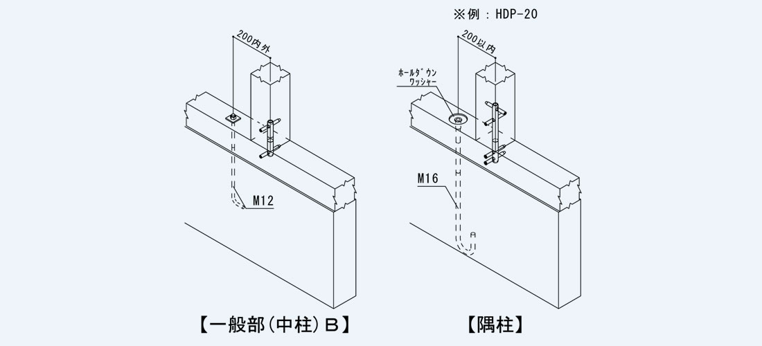 M12中ボルトMBまたは、丸座軸太ボルトMZ45を使用し、座金は厚さ4.5mm、φ45mm(または、40mm角)以上を使用してください。